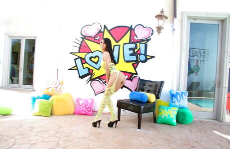 Mike Adriano: 魅力的なラテン系黒髪の爆乳アビー・リー・ブラジルがストッキング姿で巨乳を露わにし、野外で脚を広げる。