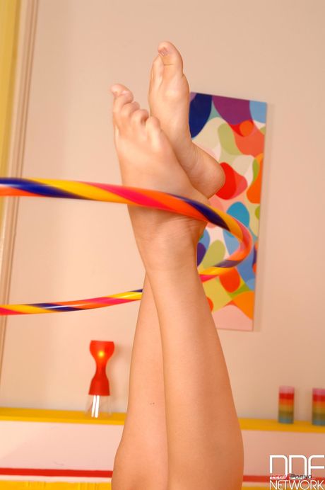 Porn World: 美しいティーン、ニキータが熱い足を見せびらかし、フラフープをもてあそぶ。