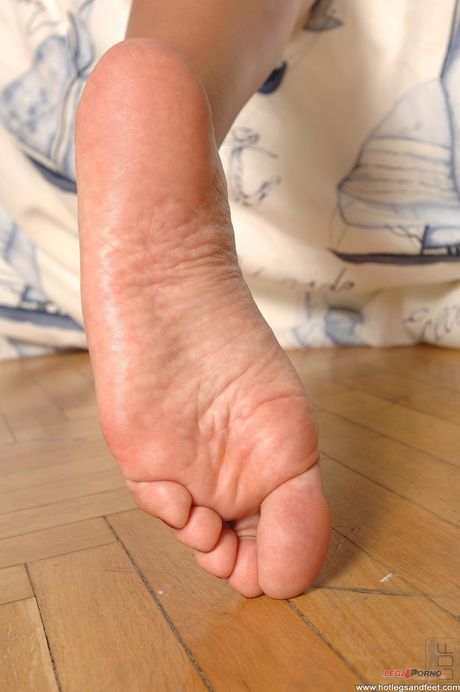 Porn World: 金髪美女ブリジット、ベッドルームで足にオイルを塗りアソコを揉む