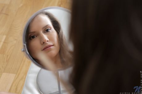 Nubiles: チャーミングなティーン、アリシア・モーンがキッチンでオナニーする前に服を脱ぐ