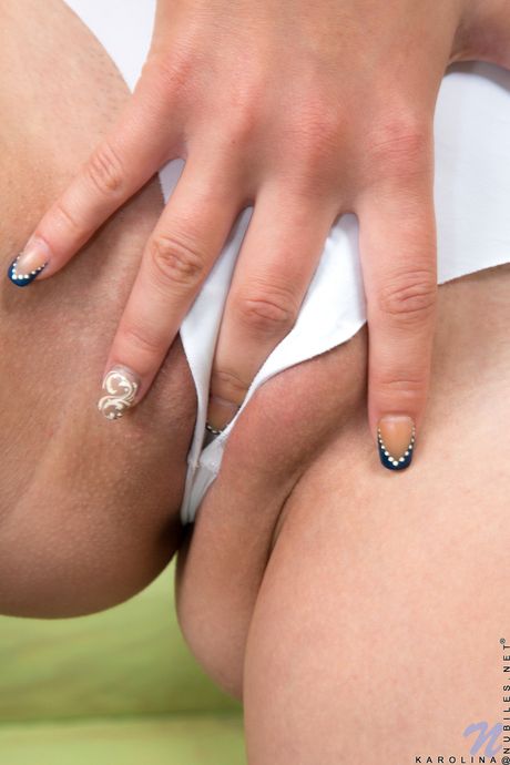 Nubiles: キュートなティーン、カロリーナがミニスカートを脱いでからアソコに指を入れる。