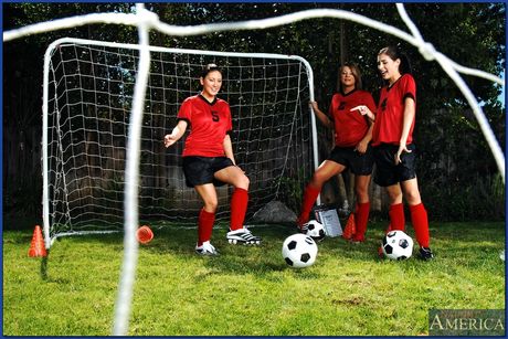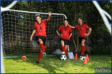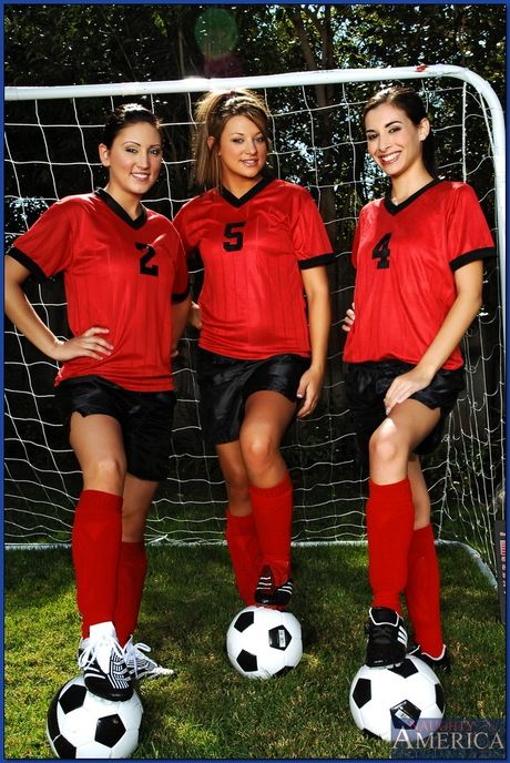 Naughty America: 注目のサッカー選手、カーメン・マッカーシー、ミンディ・メイン、トリスタン・キングスレーがストリップを披露
