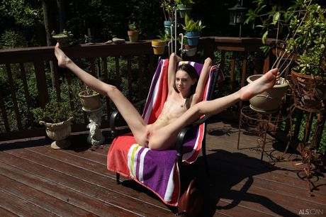 ALS Scan: 小柄なティーン、アリア・ヘイズが裏庭で裸になり、太陽の下でポーズをとる。