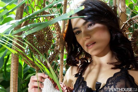 Penthouse Gold: セクシーなラティーナ、ギャッビ・マヨが小さなオッパイを披露し、ブランコでポーズをとる。