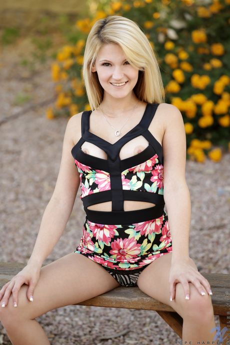 Nubiles: ブロンドのホープ・ハーパーが中庭でアソコに指を入れる。