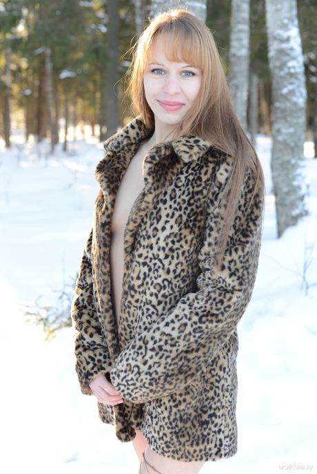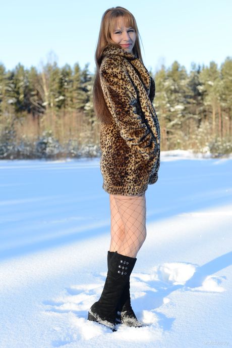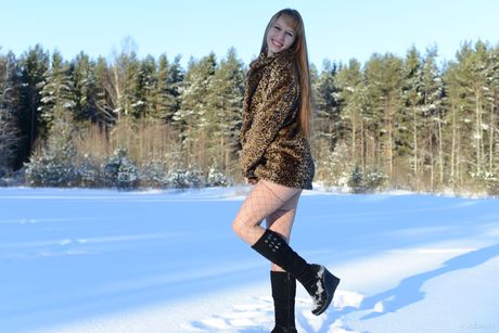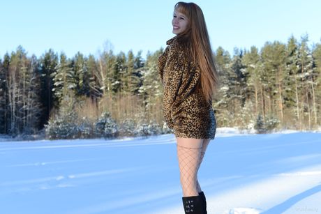 Erotic Beauty: 若い美女アルマが雪に覆われた地面でフィシュネットとブーツでヌードポーズをとる