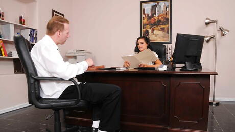 Big Tits At Work: 매혹적인 라틴 여인 제나 프레슬리가 사무실에서 막대를 빨고 털이 많은 보지에서 열심히 섹스했습니다.