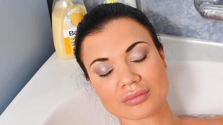 1 By Day: 매혹적인 필리핀 여인 자스민 재가 큰 가슴을 드러내고 욕실에서 다리를 벌리고 있습니다.