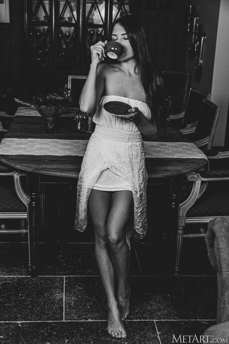 Met Art: 마그네틱 십대 니에미라가 드레스를 벗고 테이블 위에 다리를 벌리고 있습니다.