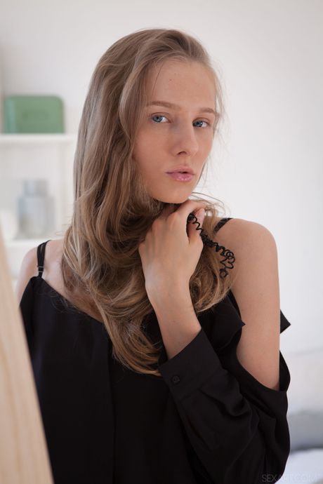 Sex Art: 러시아 복숭아 님파가 보지를 만지기 전에 비키니를 벗고 있습니다.