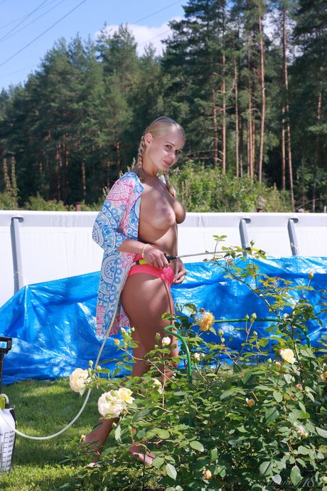 Stunning 18: 젊은 금발 다리나 N이 마당에서 알몸으로 가슴을 드러내고 있습니다.