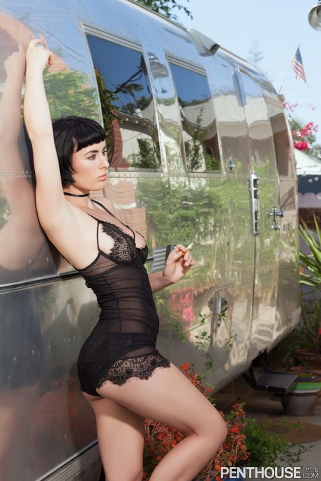 Penthouse Gold: Sexy brunette olijfglas plaagt in lingerie en legt haar sappige tieten buiten bloot