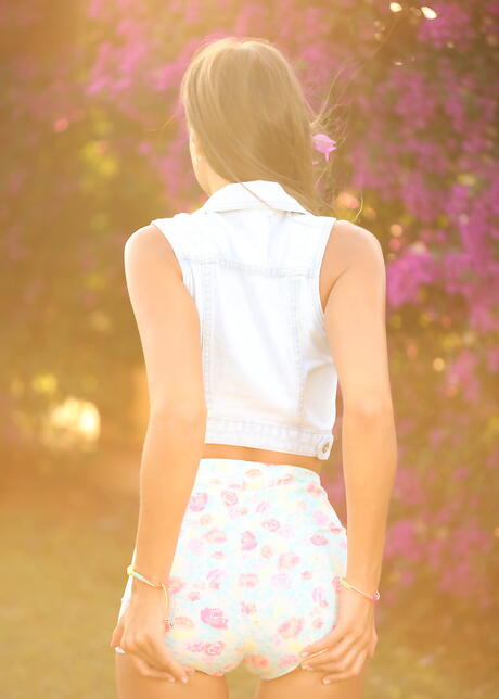 Watch 4 Beauty: Wantalige tiener melena a in een korte broek ontneemt kleine tieten en geschoren kutje buiten