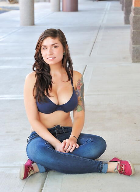 FTV Girls: Slanke donkerharige jeugdige Ellia zelfmoord in sexy jeans die grote tieten barst en haar benen verspreidt
