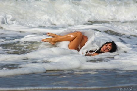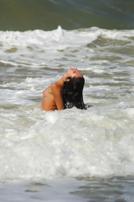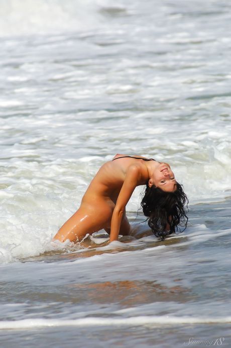 Stunning 18: Thin Teen Eldoris Q poseert naakt op een zandstrand in het water
