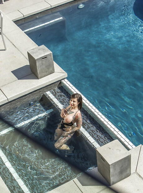 Big Wet Butts: Zeer aantrekkelijke Amerikaanse brunette hottie Dollie Darko legt grote Hooters bloot en houdt van seksspeelgoed bij pool