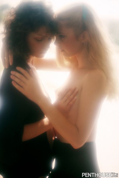 Penthouse Gold: Blonde og brunette lesbiske kysser og gnir hverandres fitter på stranden
