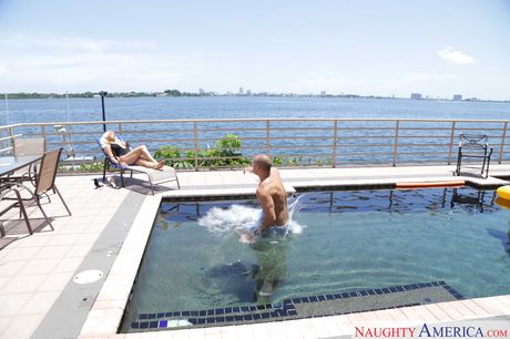Naughty America: Blonde milf Olivia Fox får de store puppene hennes jizzed etter å ha knullet i en bikini