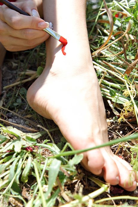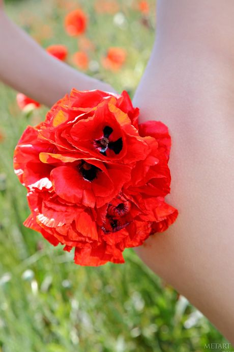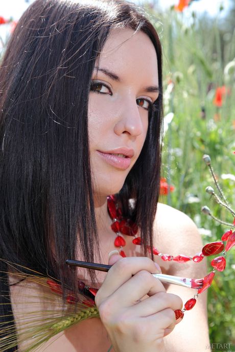 Met Art: Pen tenåring Nika e poserer naken i hagen med en blomsterbukett