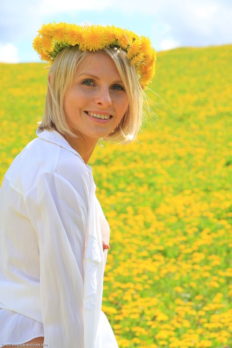 Errotica Archives: Sexy blond ekkela c strips naken i et felt med villblomster og positurer