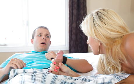 Mommy Blows Best: Sexy kanadisk blond cougar savana -stiler suger på stor stang og nyter et sædskudd i munnen