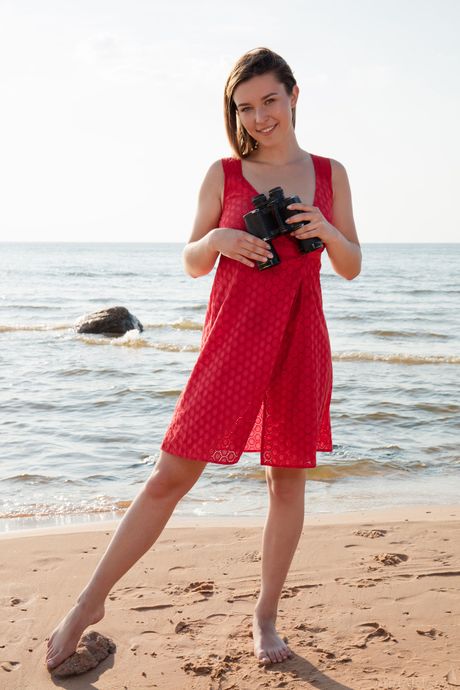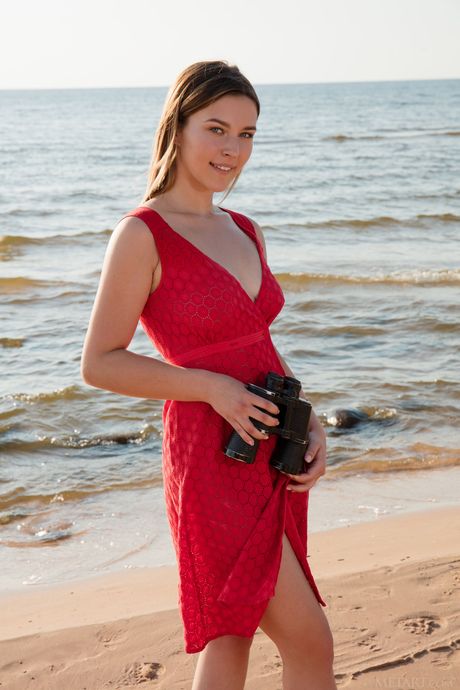 Met Art: Skinny Blonde Teen Dominika Jule blir naken på en steinete strand
