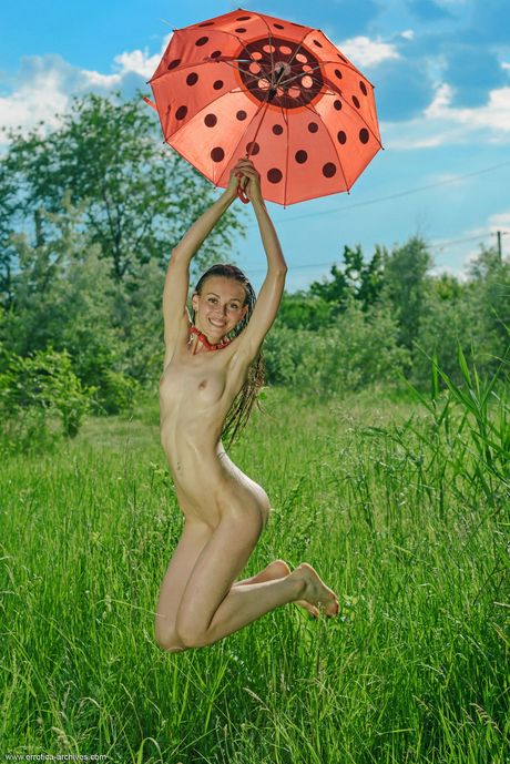 Errotica Archives: Skinny Brunette Selin poserer naken i gresset for å vise sine små pupper