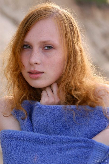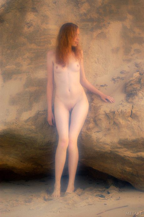 Met Art: Skinny Redheaded Teen Katya B blir naken på en strand uten forlegenhet