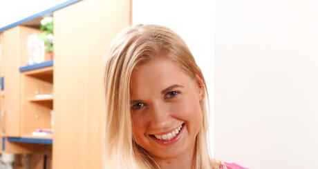 Wet And Puffy: Slank Blonde Babe Violette Pink in Sexy skjørt utsetter små pupper og onanerer