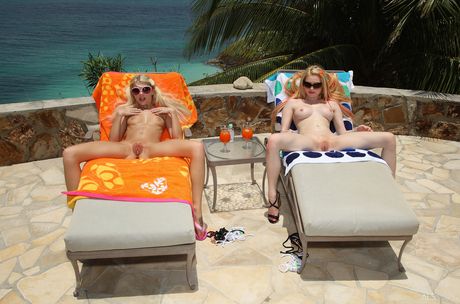 ALS Scan: Teen Lesbians Jana Foxy & Jayme Langford har sex på en uteplass i solbriller