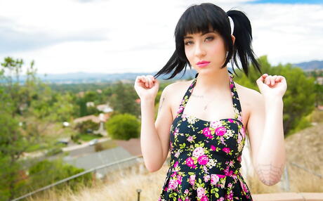 Burning Angel: Veldig attraktiv amerikansk babe Charlotte Sartre utsetter små pupper og onanerer utendørs