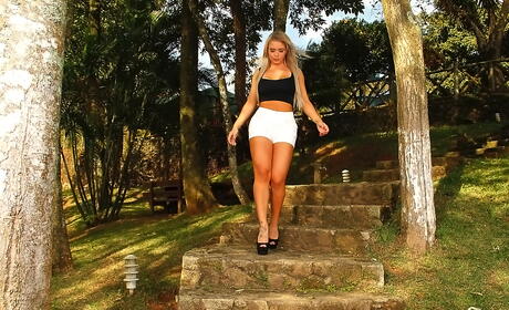 Mike in Brazil: Veldig attraktiv brasiliansk blond engel Lima i sexy shorts viser store bryster og rykk av utendørs