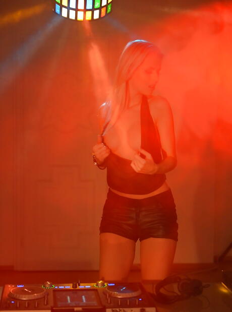 1 By Day: Veldig attraktivt svensk blond milf Lynna Nilsson i shorts som utsetter store hootere og onanerer