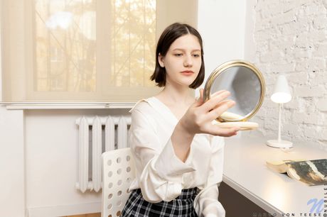 Nubiles: Oszałamiająca nastolatka Margo von Teese usuwa strój biurowy, zanim się masturbuje