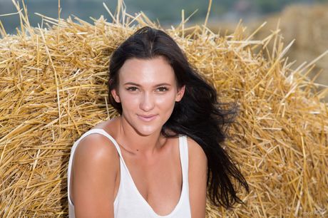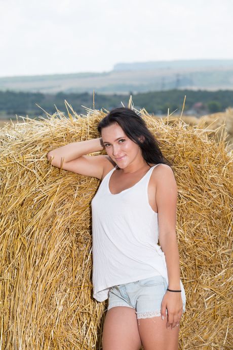 Erotic Beauty: Ukraińska modelka erotyczna Indiana Blanc ujawnia swoją nagą formę na polu siana i pokazuje swoje piersi i cipki