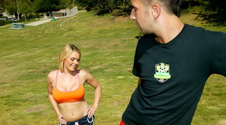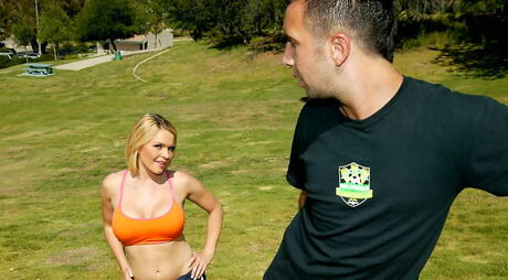 Big Tits At School: Bardzo atrakcyjna amerykańska blondynka Krissy Lynn w gorącym scenie seksu na zewnątrz