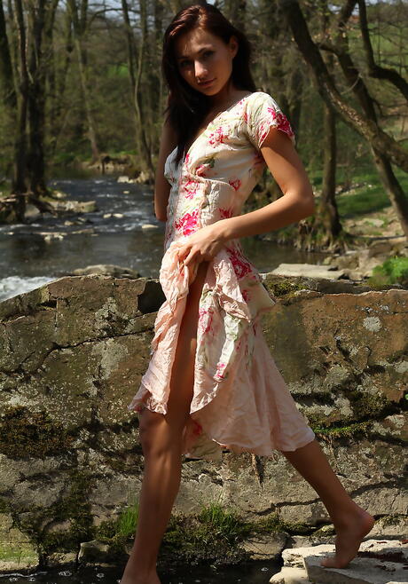 Met Art: Adolescente tcheco esbelto Michaela Isizzu em saia sexy mostrando grandes knockers e espalhando as pernas ao ar livre