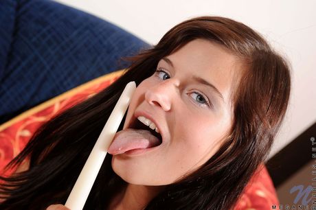 Nubiles: Lockande tonåring Megane onanerar med en vibrator på en säng i naken