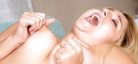 Naughty Mag: Tilltalande amerikansk blond hottie Kimmy Fabel avslöjar stora hooters och onanerar