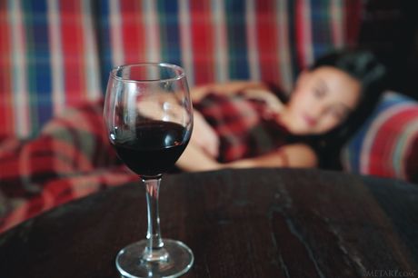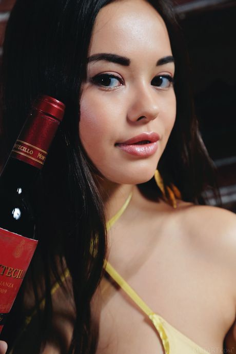 Met Art: Asian Teen Li Moon häller sig ett glas vin innan du blir naken
