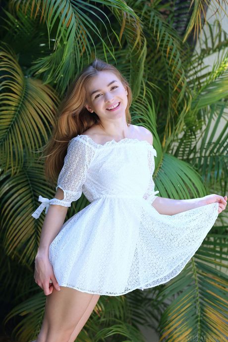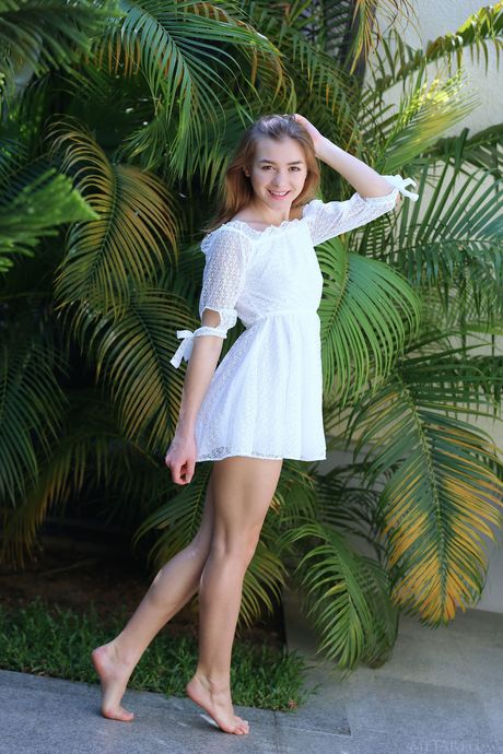 Met Art: Bashful Teen Kaleesy tar bort en kort klänning för att posera naken på en uteplats