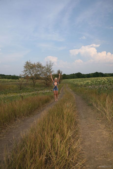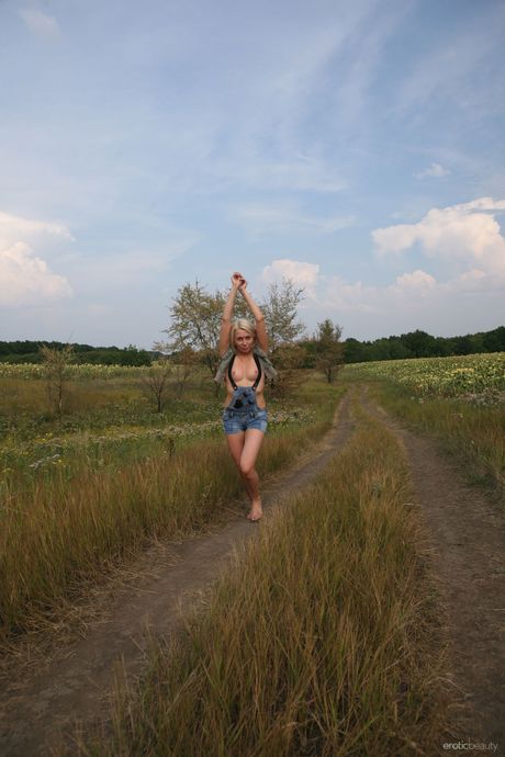 Erotic Beauty: Blond Teen Rina D -modeller helt nakna på en filt i ett jordbruksfält