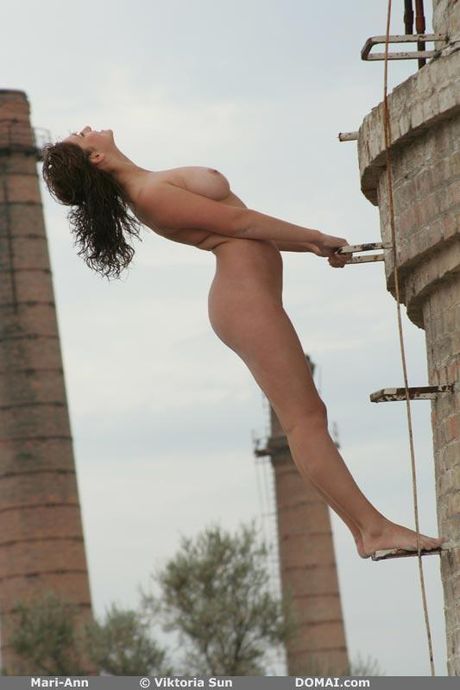Domai: Busty Teen Mari Ann modeller helt naken på en uteplats utan blyghet