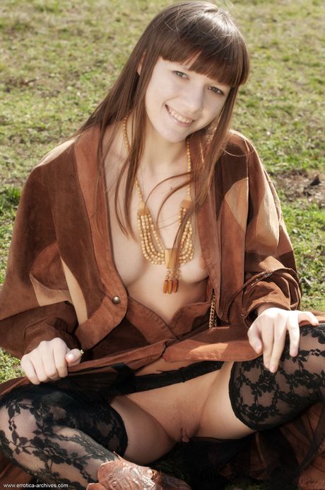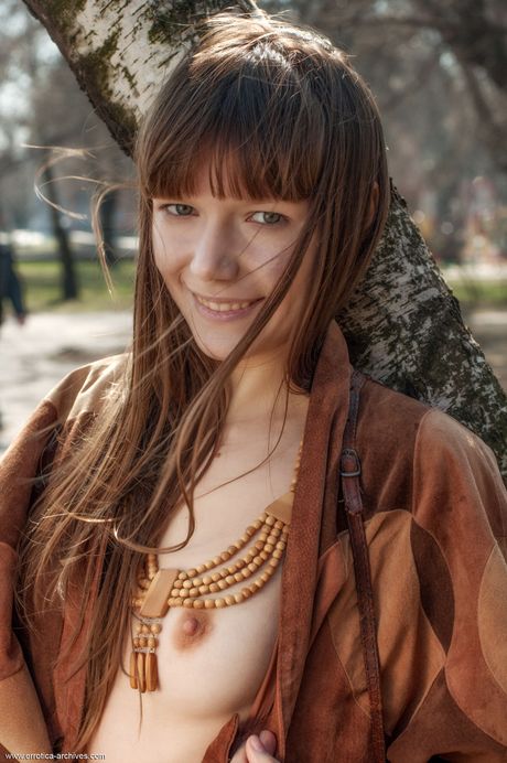 Errotica Archives: Långhårig tonåring röd Eva avslöjar hennes bröst och twat på ett offentligt torg