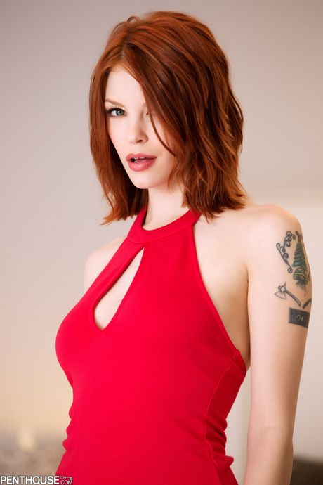 Penthouse Gold: Redhead Bree Daniels tar bort en kort röd klänning innan hon sprider sin fitta