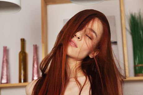 Sex Art: Sexig rödhårig sherice blir naken på kaféet och onanerar