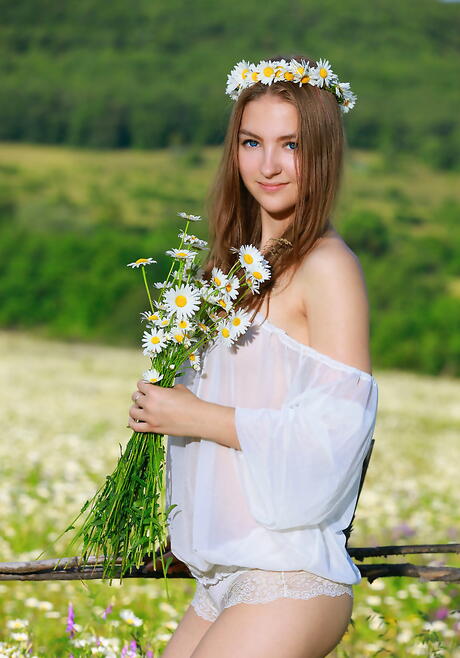 Met Art: Välformad tonåring izabel a i sexiga shorts exponerar stora bröst och sprider benen utomhus