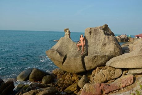 Erotic Beauty: Mager rödhårig Sarka poserar naken på stranden och i vattnet