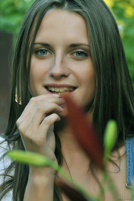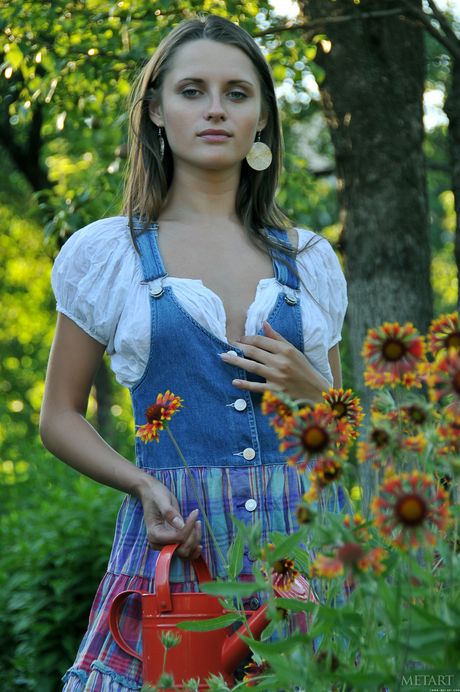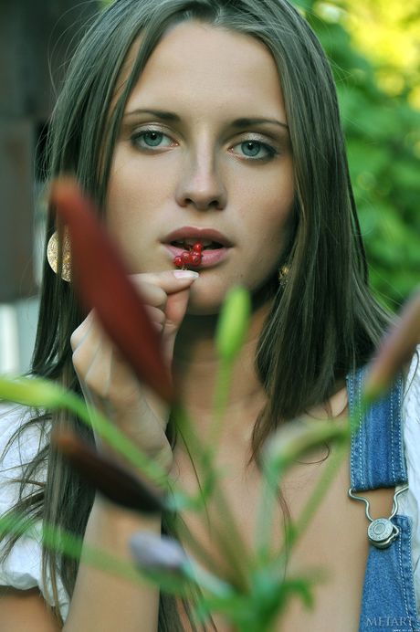 Met Art: Smal tonåring nata f remsor och poserar naken i trädgården med en vattenmelon