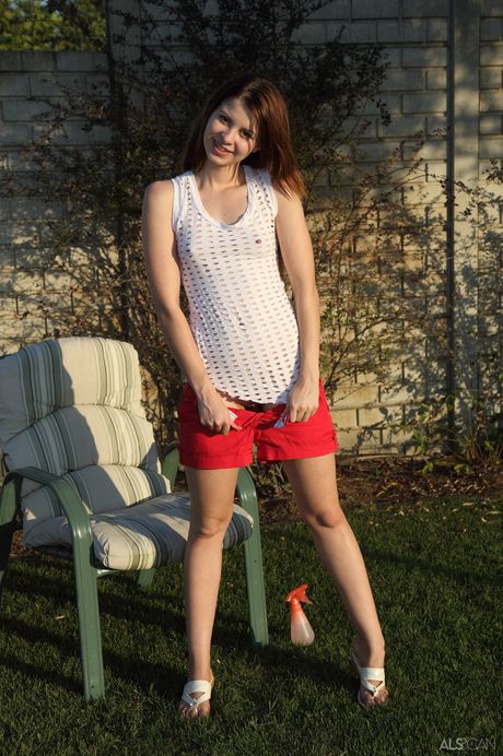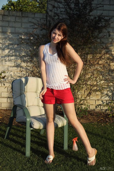 ALS Scan: Tunn tonåring Judy leende remsor och leksaker hennes fitta utomhus med sin vän